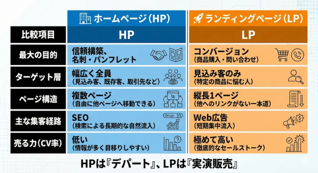 ランディングページ(LP)とホームページ(HP)の違い一覧表